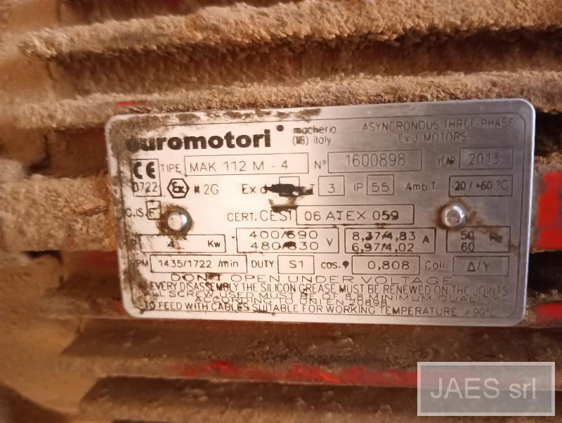 THREE-PHASE MOTOR WITH SQUIRREL CAGE ROTOR; RATED POWER 1: 5.5 HP; RATED POWER 2: 4 KW; SPEED: 1500 RPM; RATED ELECTRICAL VOLTAGE: 220 / 380 V; FREQUENCY: 50 HZ; CONSTRUCTION SIZE: 112M; CONSTRUCTION FORM: B3 / B5; SERVICE CLASS: S1; INSULATION CLASS: GR-AR; TYPE OF PROTECTION: IP55; STANDARD / EFFICIENCY: IEC-IE3; MANUFACTURER 1: EUROMOTORI; PART-N 1: SLF112M; MODEL 1: EMA 112M28F215-4 - NR7854 / 90E