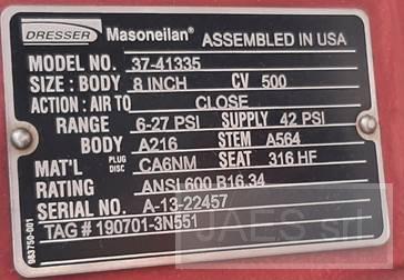 VALVE TAG- BY-UV-0X521 (X=1,2,3), BY SGC ANTI-SURGE VALVE, MANUFACTURER: DRESSER MASONEILAN, MODEL: 37-41335, SIZE: BODY 8INCH CV 500, ACTION: AIR TO CLOSE, RANGE: 6-27 PSI SUPPLY 42 PSI, BODY: A216, STEM: 564, MATERIAL: PLUG DISC CA6NM SEAT 316 HF, RATING: ANSI 600 B16.34, (EXISTING SN: A-13-22457)
